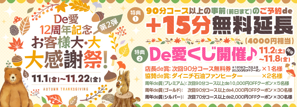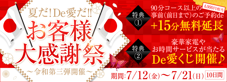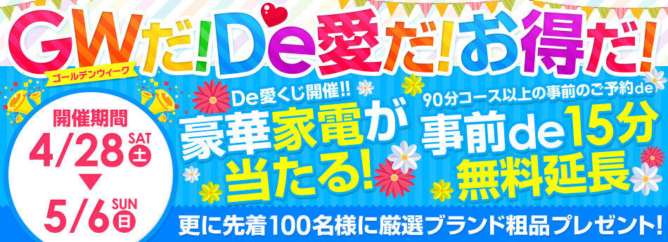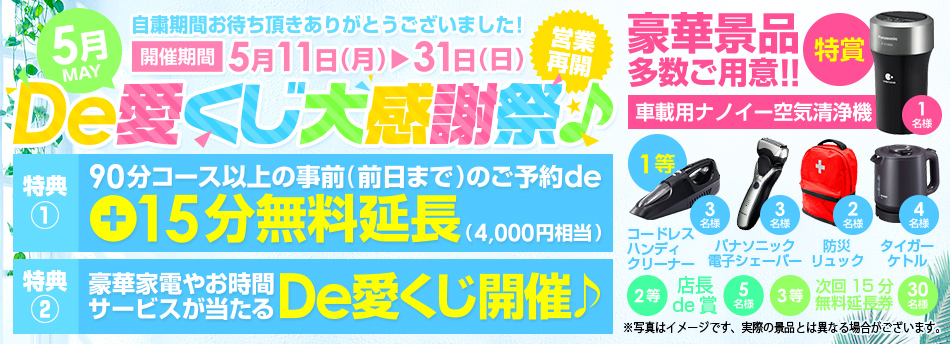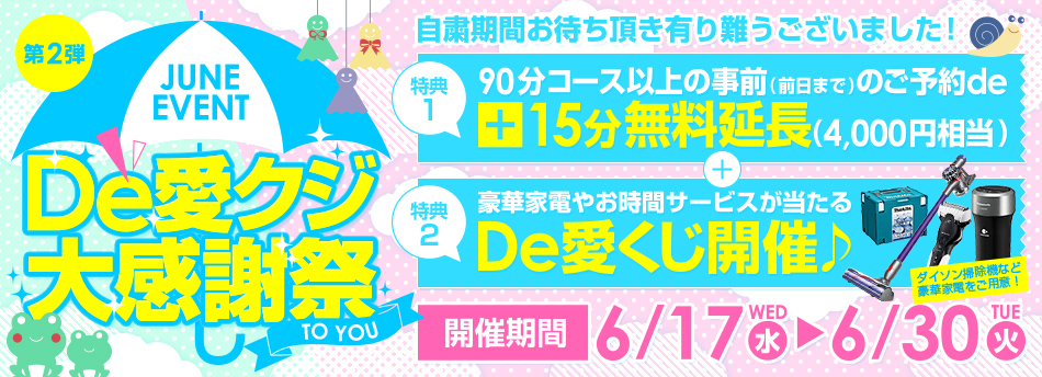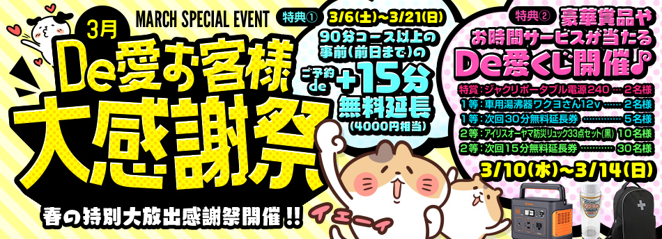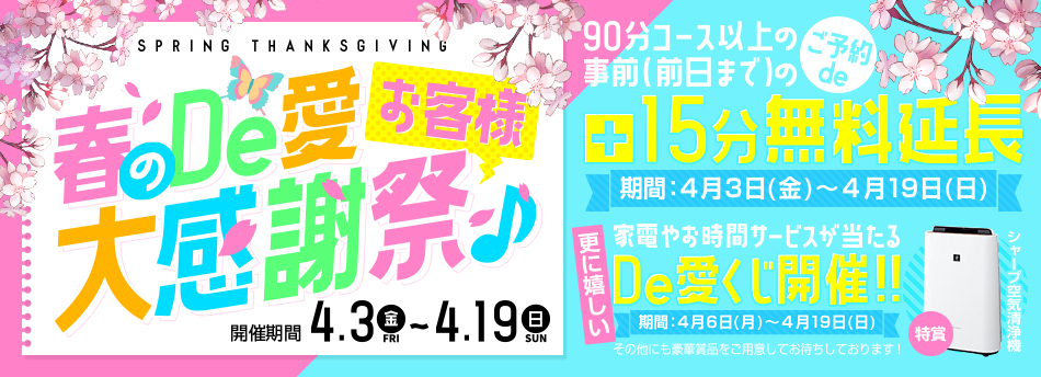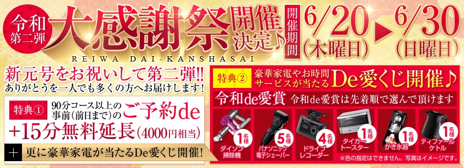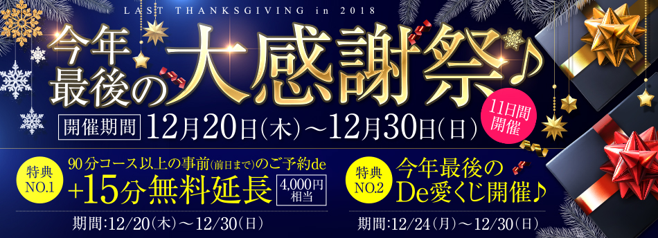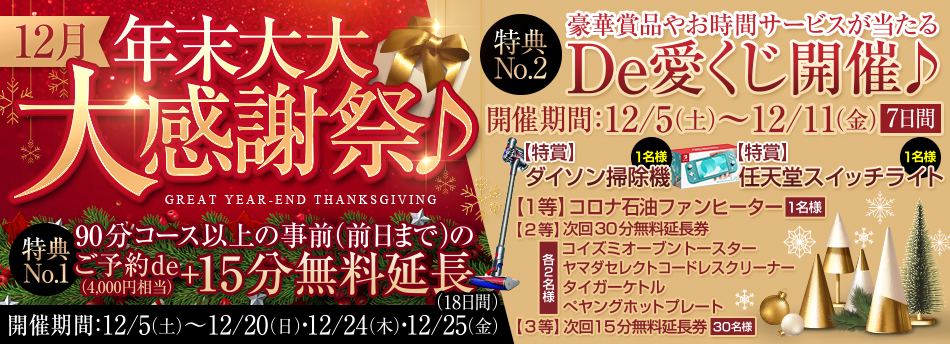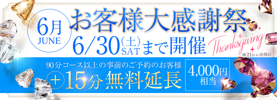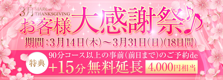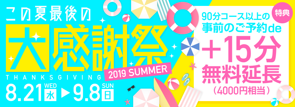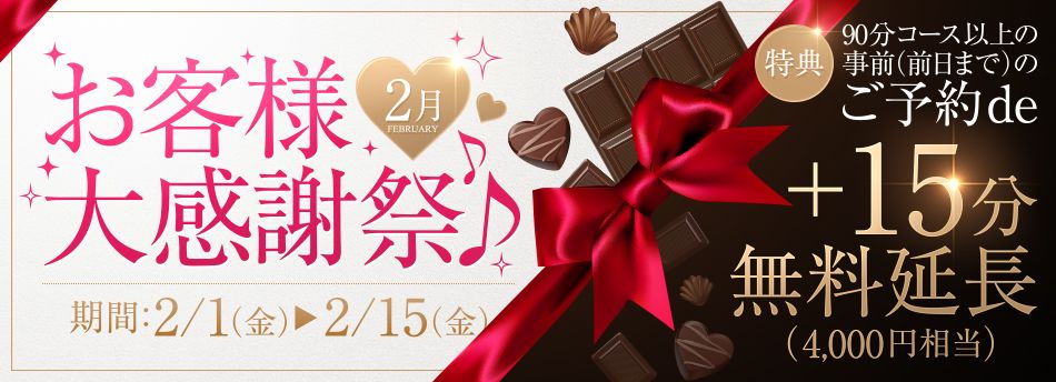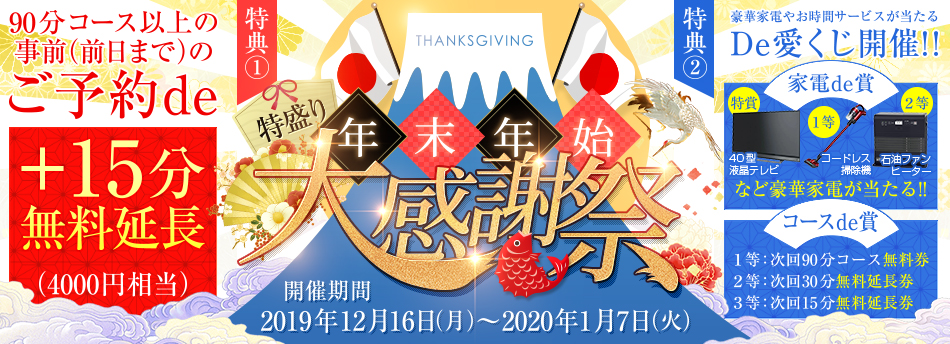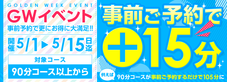 特典:90分コース以上の事前(前日まで)のご予約de+15分無料延長(4000円相当)