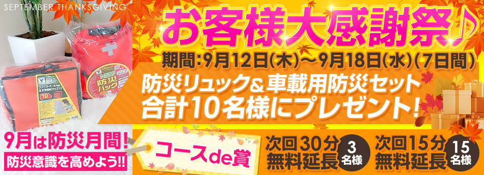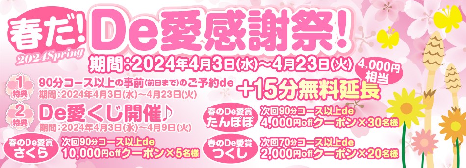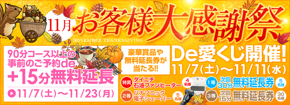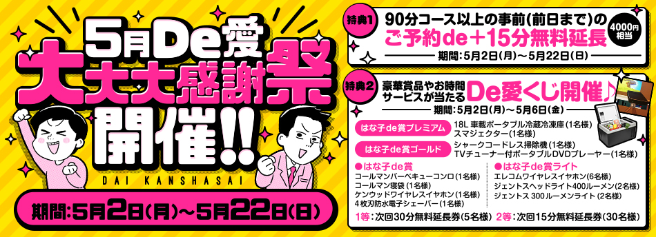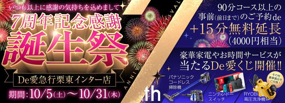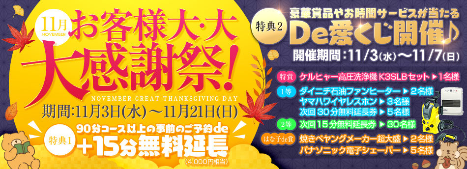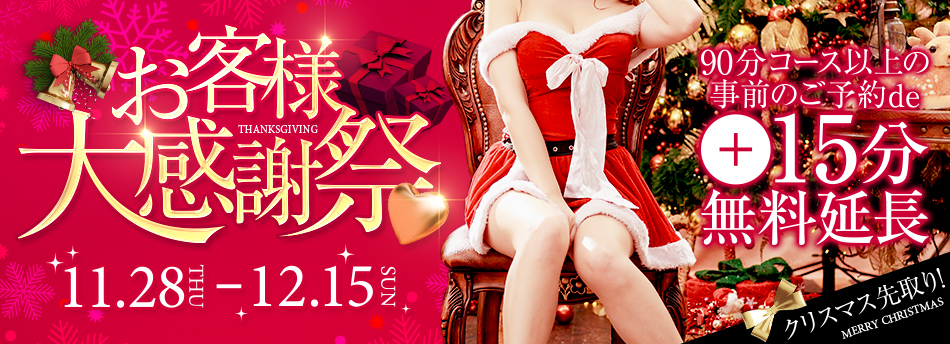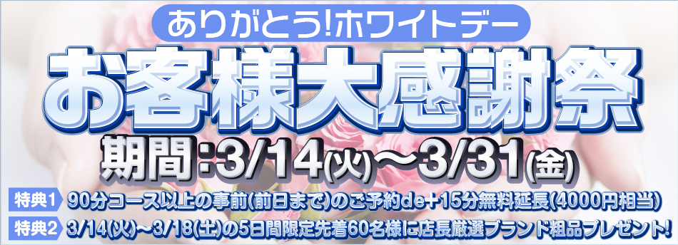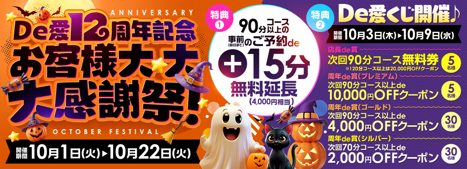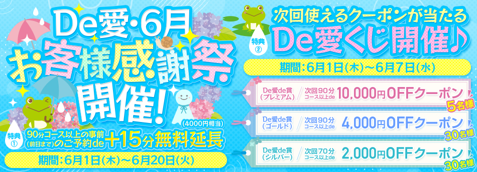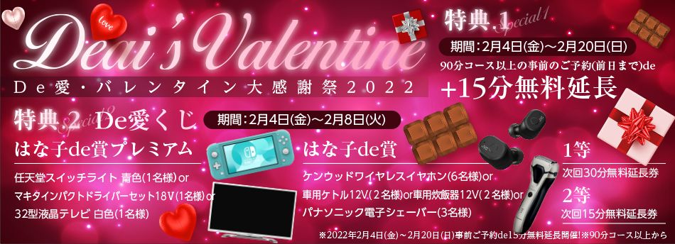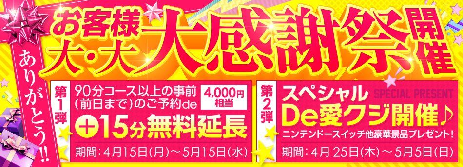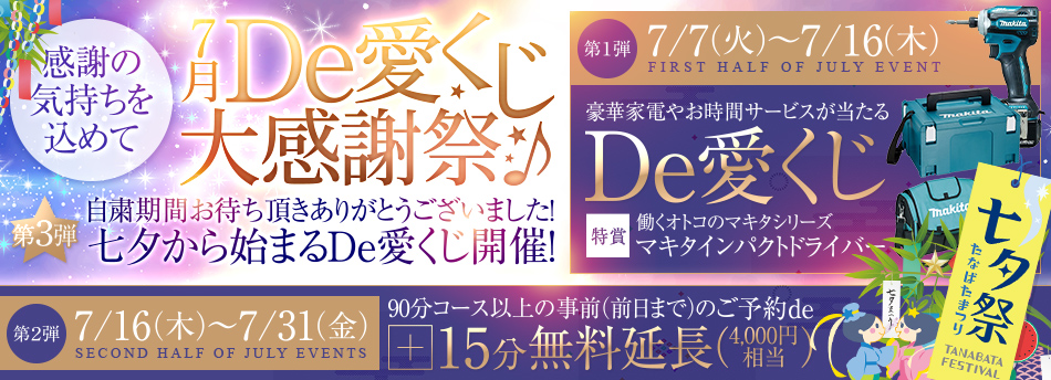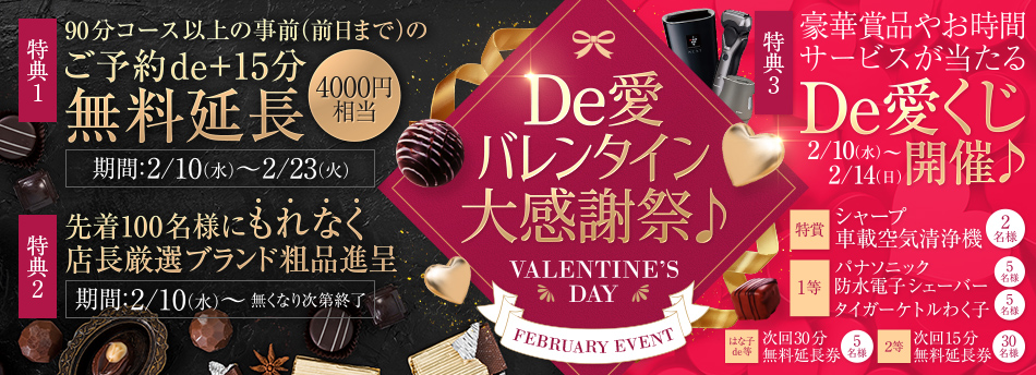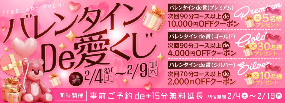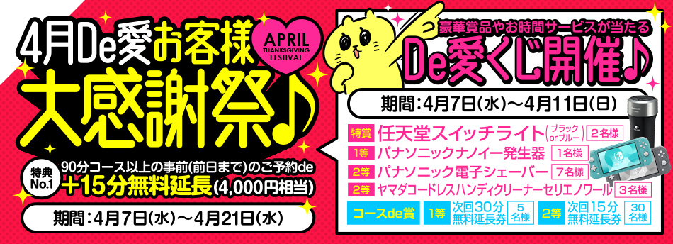 特典:90分コース以上の事前(前日まで)のご予約de+15分無料延長(4000円相当)