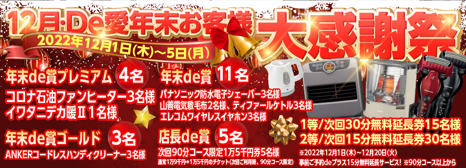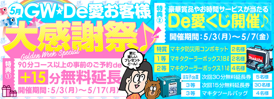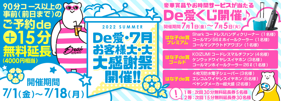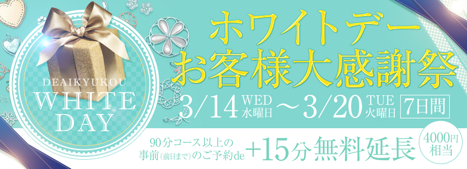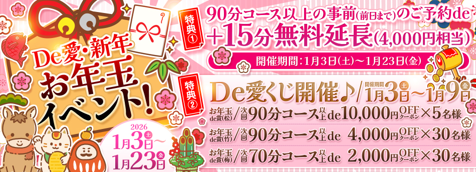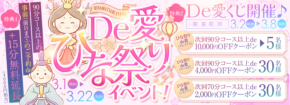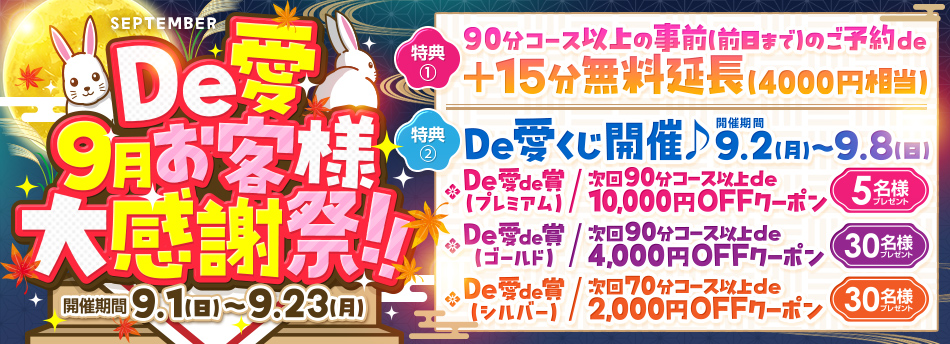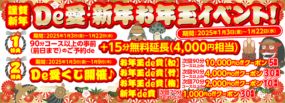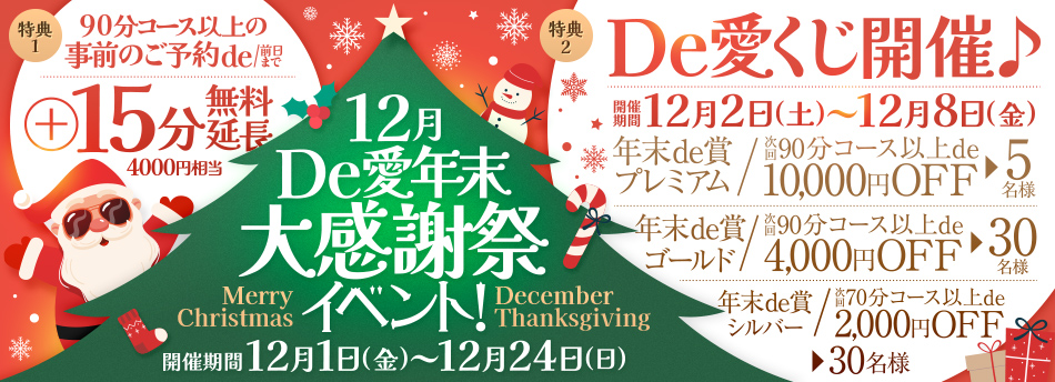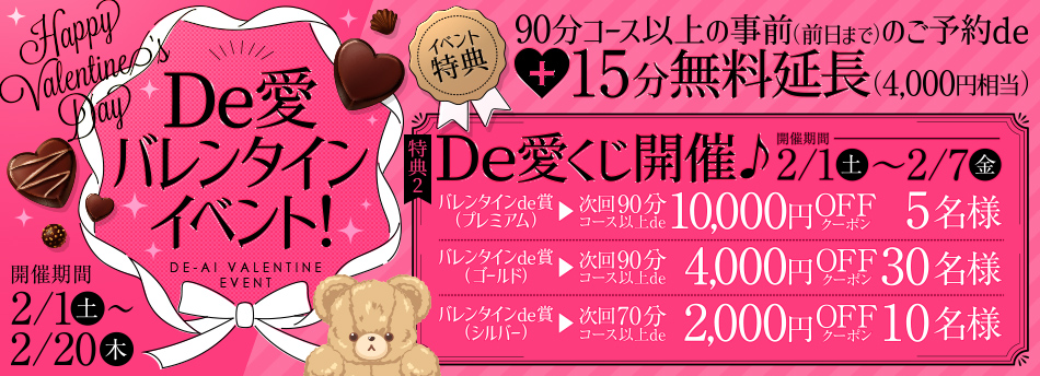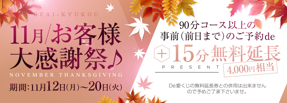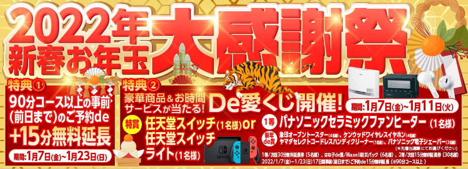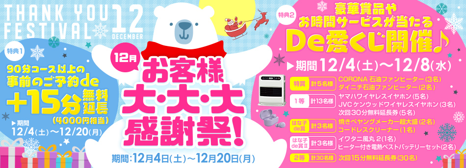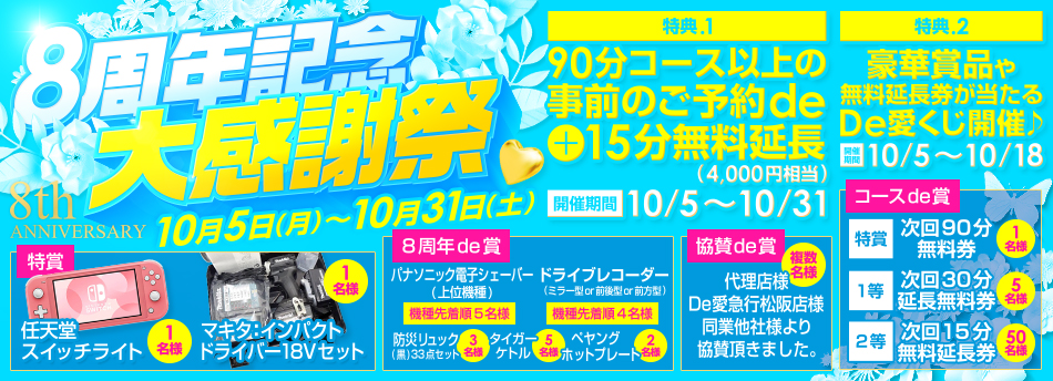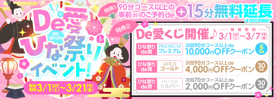 特典:90分コース以上の事前(前日まで)のご予約de+15分無料延長(4000円相当)